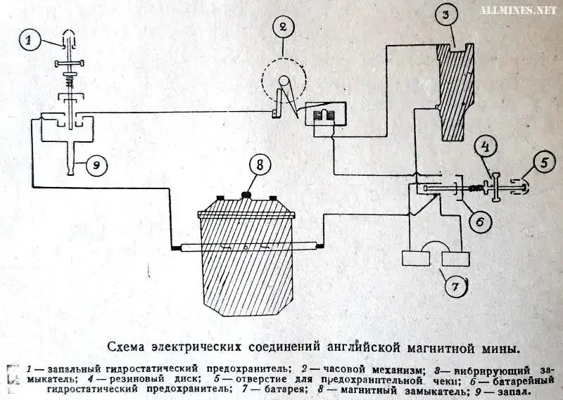 Электрическая схема английской магнитной донной мины, примененной на Северной Двине в 1919 г.