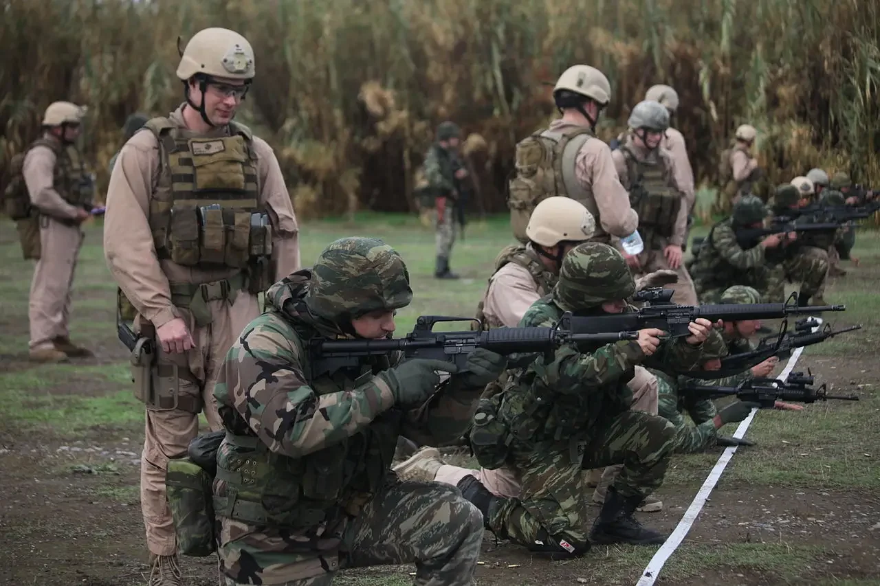 Греческие солдаты и американские морпехи на огневом рубеже. Фото Военного министерства США